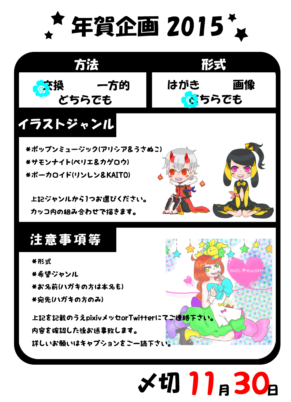 今年は恐らく1枚ずつ手書き出来る余裕が無いと思われますので、ジャンルごとに決まった絵柄にする予定です。